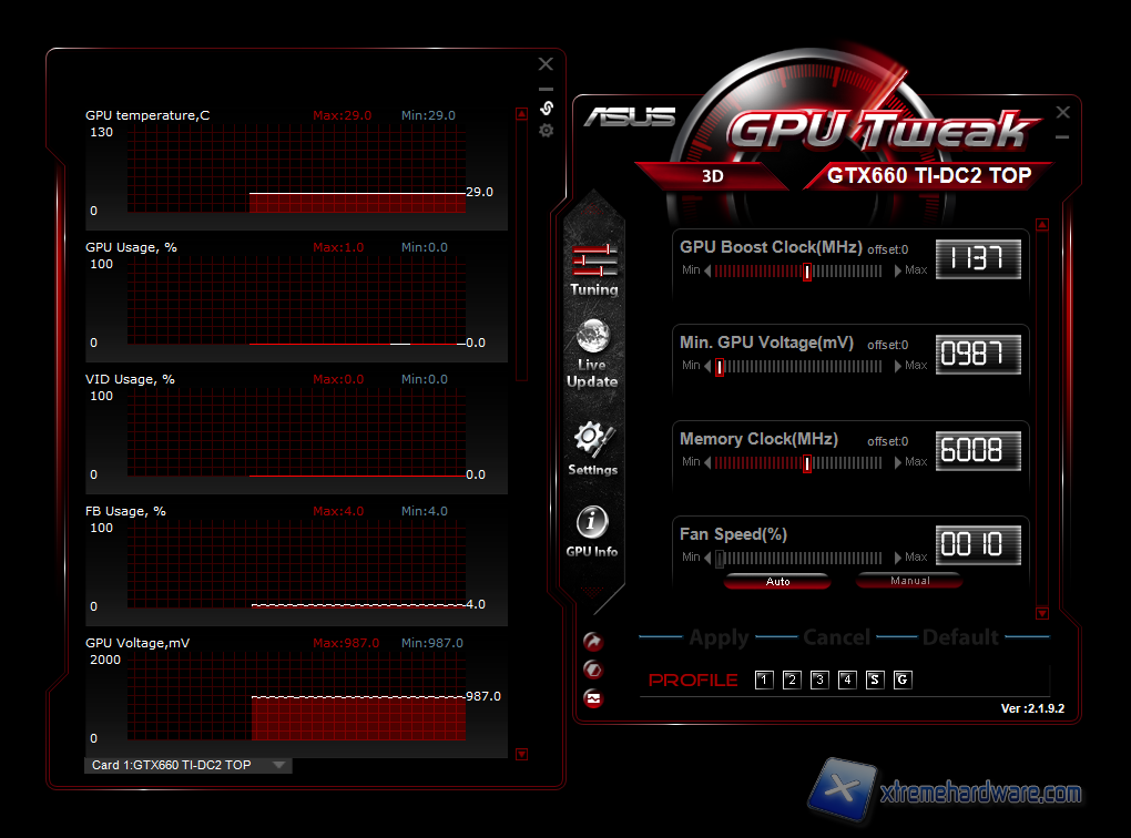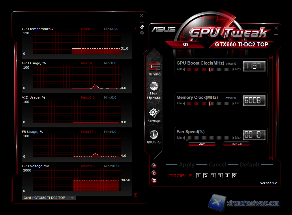 Attivando un'opzione dalle impostazioni è possibile far comparire anche il GPU Voltage che nel nostro caso è impostato a 0.987V. Utilizzando questo software abbiamo eseguito varie prove sulla GTX 660Ti di Asus. La prima di queste è stata la ricerca della massima frequenza stabile per GPU e memorie non intervenendo con l'overvolt; successivamente sono state eseguite altre prove, aumentando moderatamente il GPU Voltage. La prima prova, come detto sopra, consiste nel mantenere tutti i settaggi su AUTO mentre  il GPU voltage è stato mantenuto su livello standard.